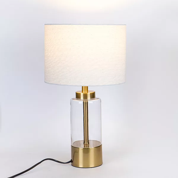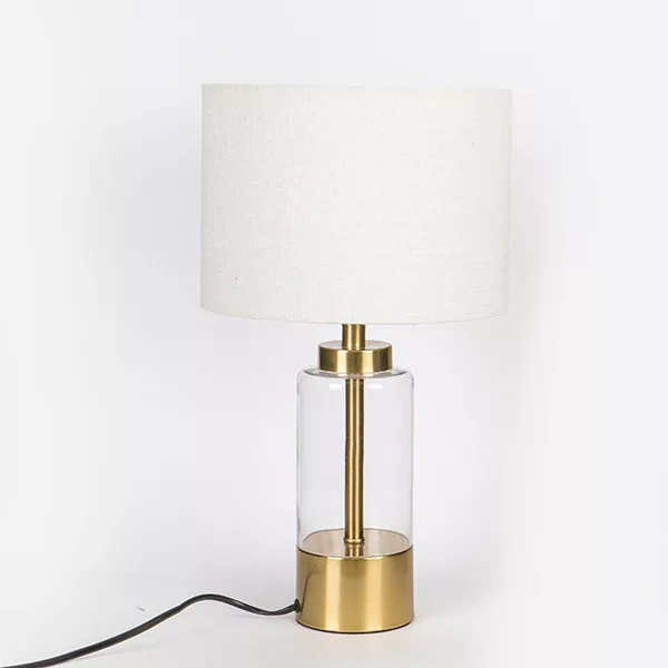 Fém asztali lámpa üveg részletekkel az alapon, arany színben.