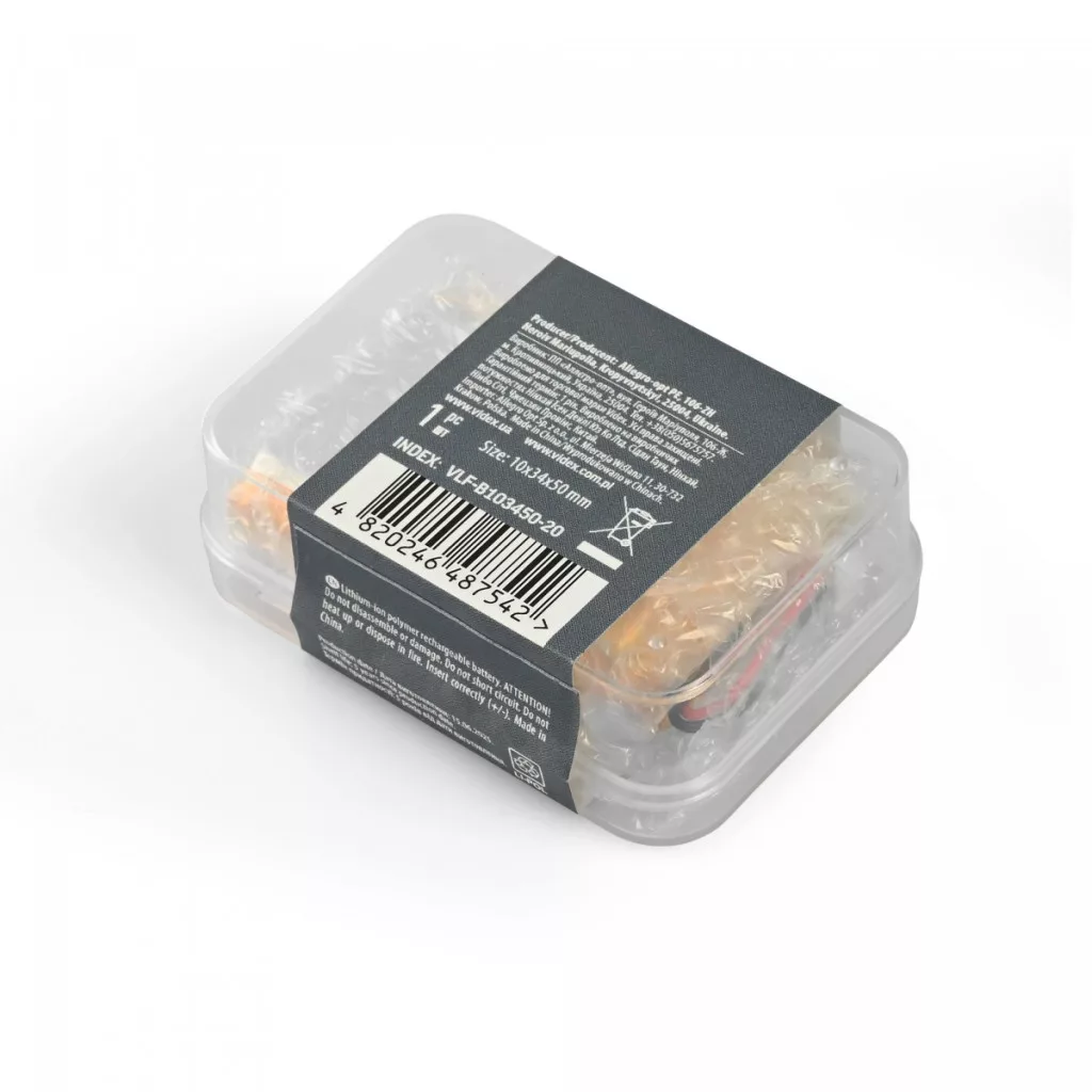 A VIDEX Li-pol VLF-B103450-20 újratölthető akkumulátort kifejezetten a VIDEX fejlámpáinak áramforrásaként tervezték és szánták.